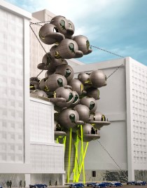 This is the Storytelling pavilion. Its primary functions are to observe, discover and transmit by means of moving eye tentacles. Each pavilion tentacle expands and shrinks its body dimensions. Change in scale is possible due to attractors. The tentacles zoom-in